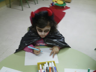 El pasado viernes el grupo de alumnas de 1º-A de Educación Infantil se estrenaron en un cole amigo: el CEIP Manuel Núñez de Arenas. A lo largo de la mañana hicieron talleres, cuenta-cuentos, juegos y actividades con todos los niños y niñas del colegio. Hicieron "fantaracas", carteles, jugaron al paracaídas y un montón de actividades relacionadas con esta celebración tan divertidamente tenebrosa y tan europea -aunque algunos no lo creen... el que lo dude que consulte este post antiguo en el que lo narraba.